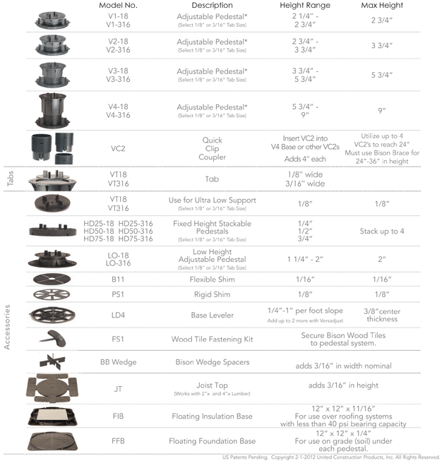 Environmentally FriendlyBison™ Versadjust© pedestals are made with 20% post-industrial recycled content and are 100% recyclable. Low Height Installations Use Model LO pedestal for adjustability from 1 ¼" - 2" or fixed height pedestals for heights from 1/8" - 1 ¼".