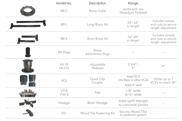 • Supports heaviest load: 1,250 lbs per pedestal (FS:3) • Integrated Base Levelers accomodate 0 to ½ inch per foot slope • Versadjust adjustable system height range is 2 ¼ inches to 36 inches • Accessories for heights from 1/8 inch to 2 ¼ inches • Contains 20% Post-Industrial Recycled Material • Impervious to water, mold and freeze/thaw • Usually ships in 1 - 2 business days • Made in the U.S.A.